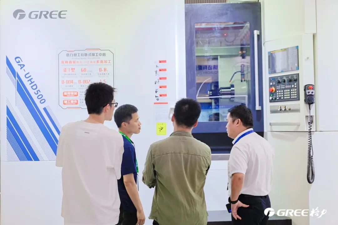 在焦微小孔、3C电子、高精密模具等领域,格力展出了全直驱立式加工中心GA-DV750,可加工涡旋盘、石墨模具、微小孔径钻孔、手机壳后盖等零件。而高刚性立式加工中GA-UV1050则专为新能源汽车、航空航天、工程机械等领域的需求打造,300Nm大扭矩重切销,可加工轮毂、电机端盖、装饰条盖等零件。